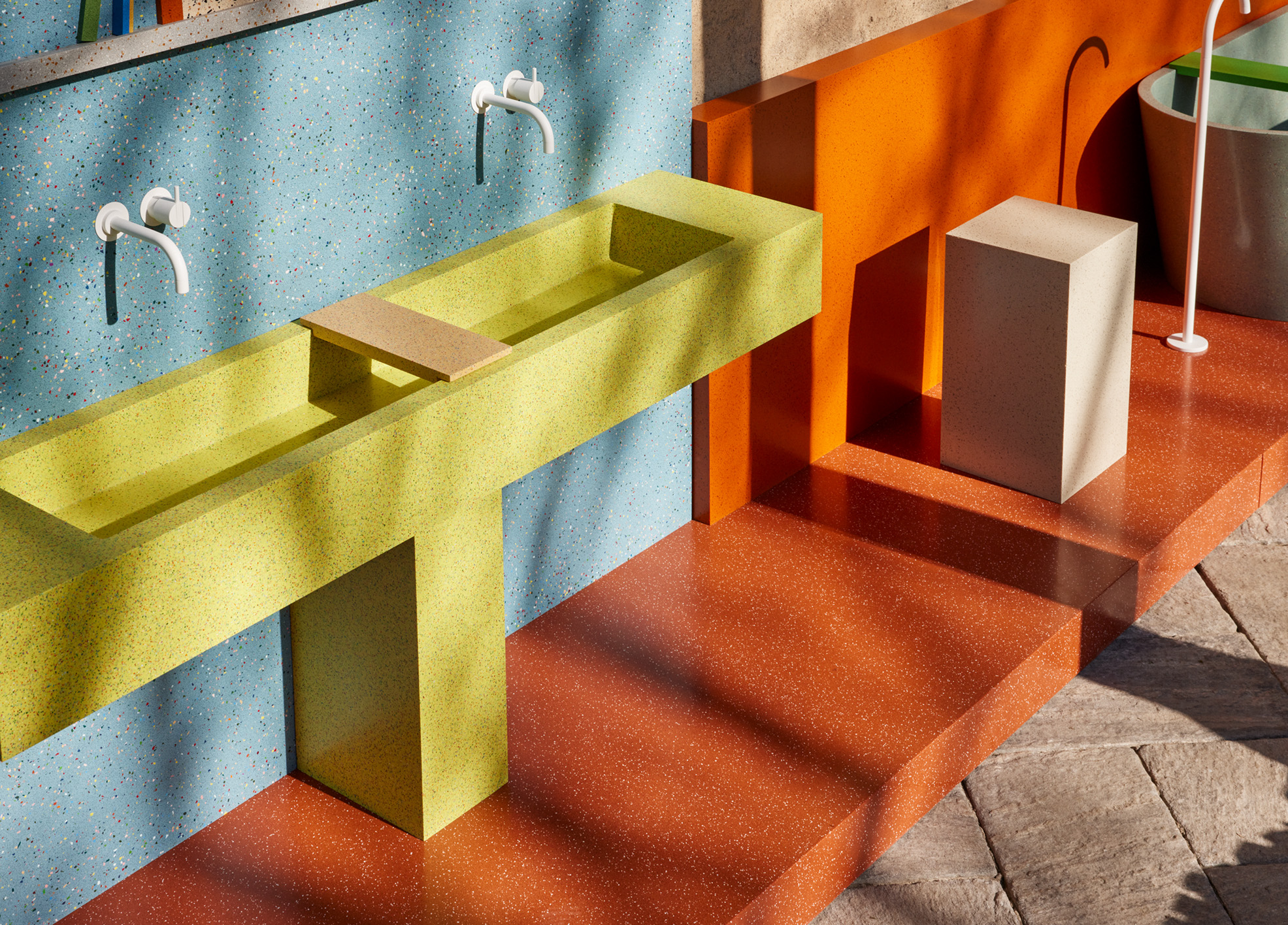 Desde el punto de vista estético, estas superficies ofrecen una gama cromática extensa y adaptable, que incluye tonalidades neutras, colores intensos y acabados con agregados visibles —fragmentos reciclados que aportan textura, profundidad y un carácter distintivo—. Esta flexibilidad permite desarrollar soluciones cromáticas personalizadas, alineadas con las exigencias conceptuales de cada proyecto.