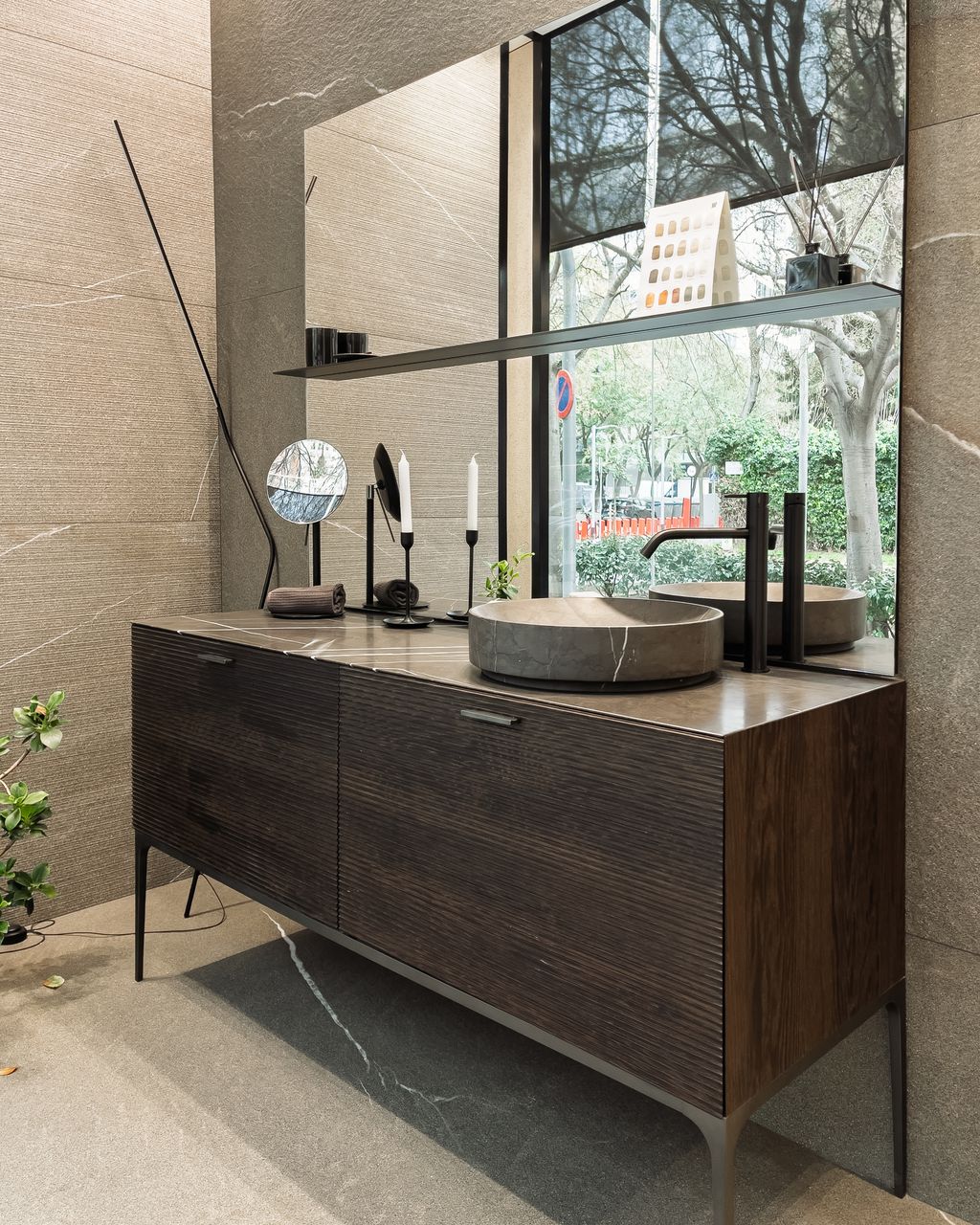 En mármol Bianco Carrara, Pietra Moka y Pietra Ardesia. Medidas 880x450Ø mm. Espejo biombo con iluminación led 4000K incluído. Toallero de pie incluído.