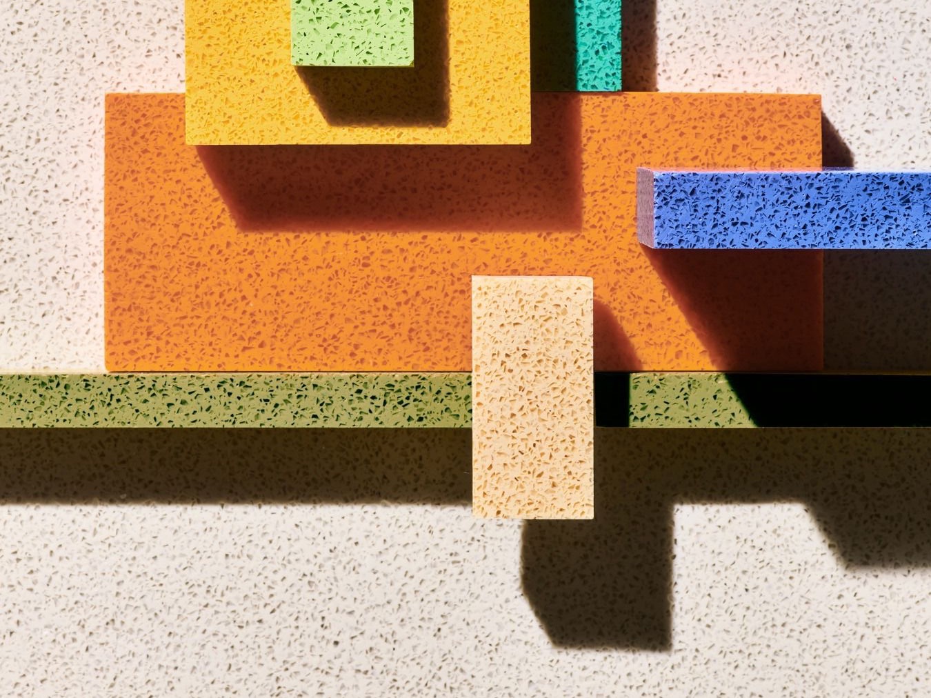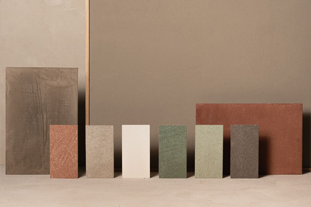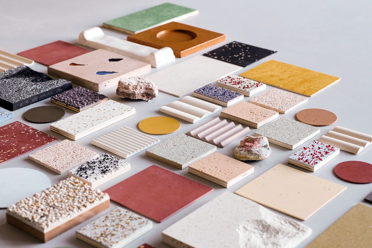 En el caso de las baldosas y placas, el material presenta un marcado carácter volumétrico, con variaciones controladas en textura y composición según el acabado. La formulación puede ajustarse mediante distintos porcentajes de agregados o la incorporación de materiales reciclados, como vidrio, permitiendo modular tanto el comportamiento técnico como la expresión material de la superficie.