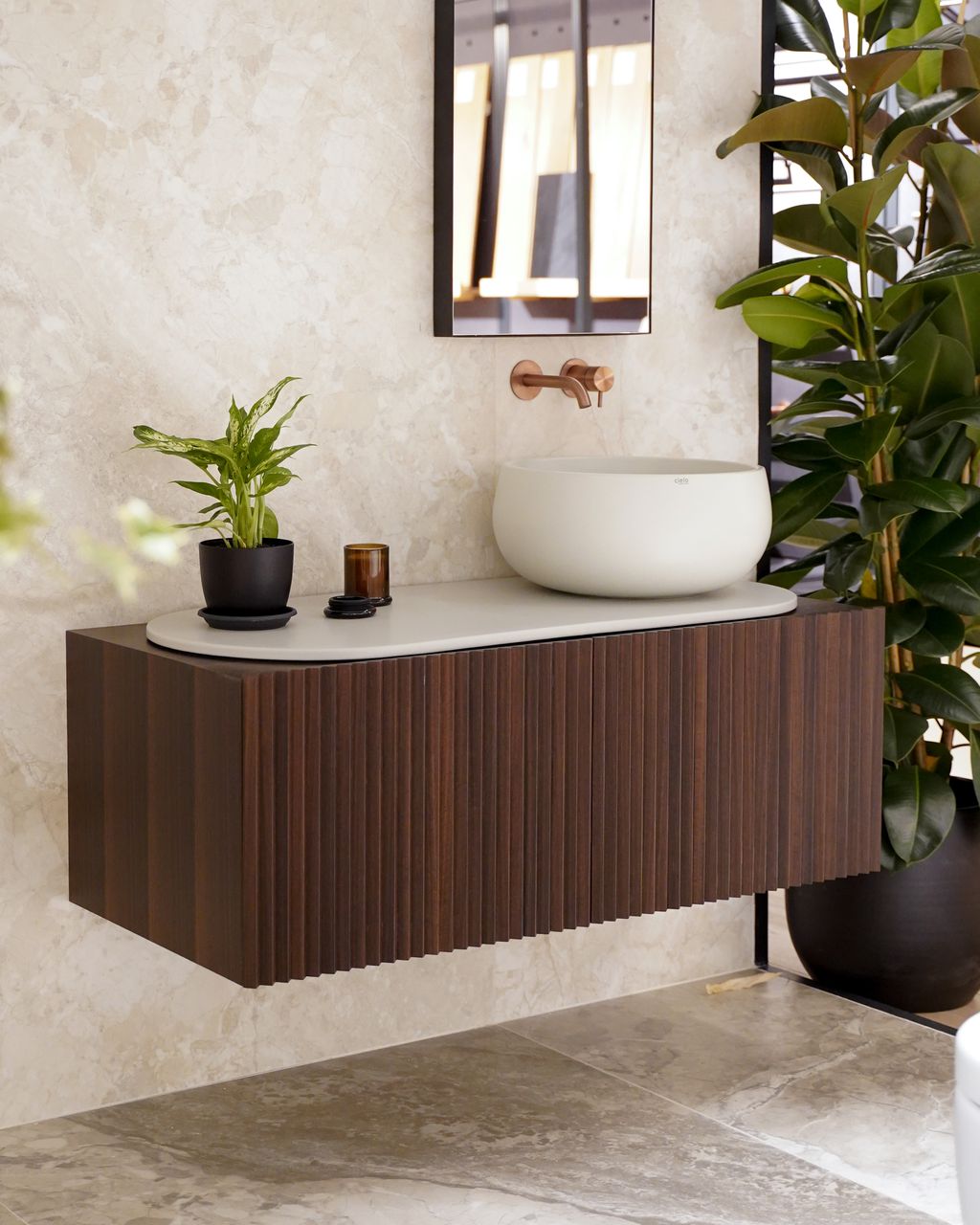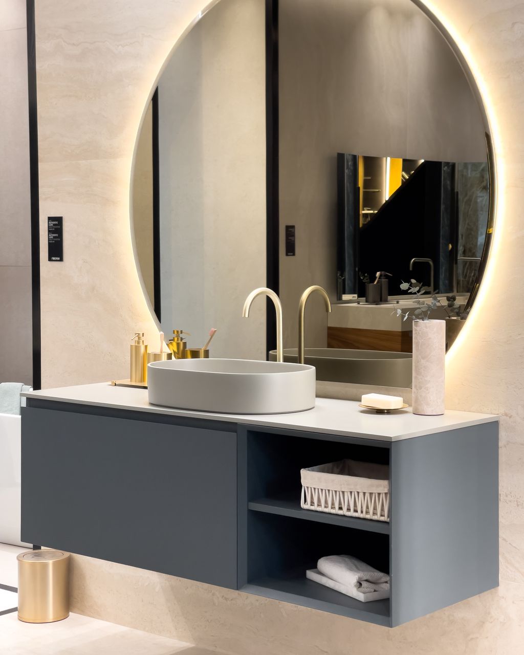 En mármol Bianco Carrara, Pietra Moka y Pietra Ardesia. Medidas 880x450Ø mm. Espejo biombo con iluminación led 4000K incluído. Toallero de pie incluído.