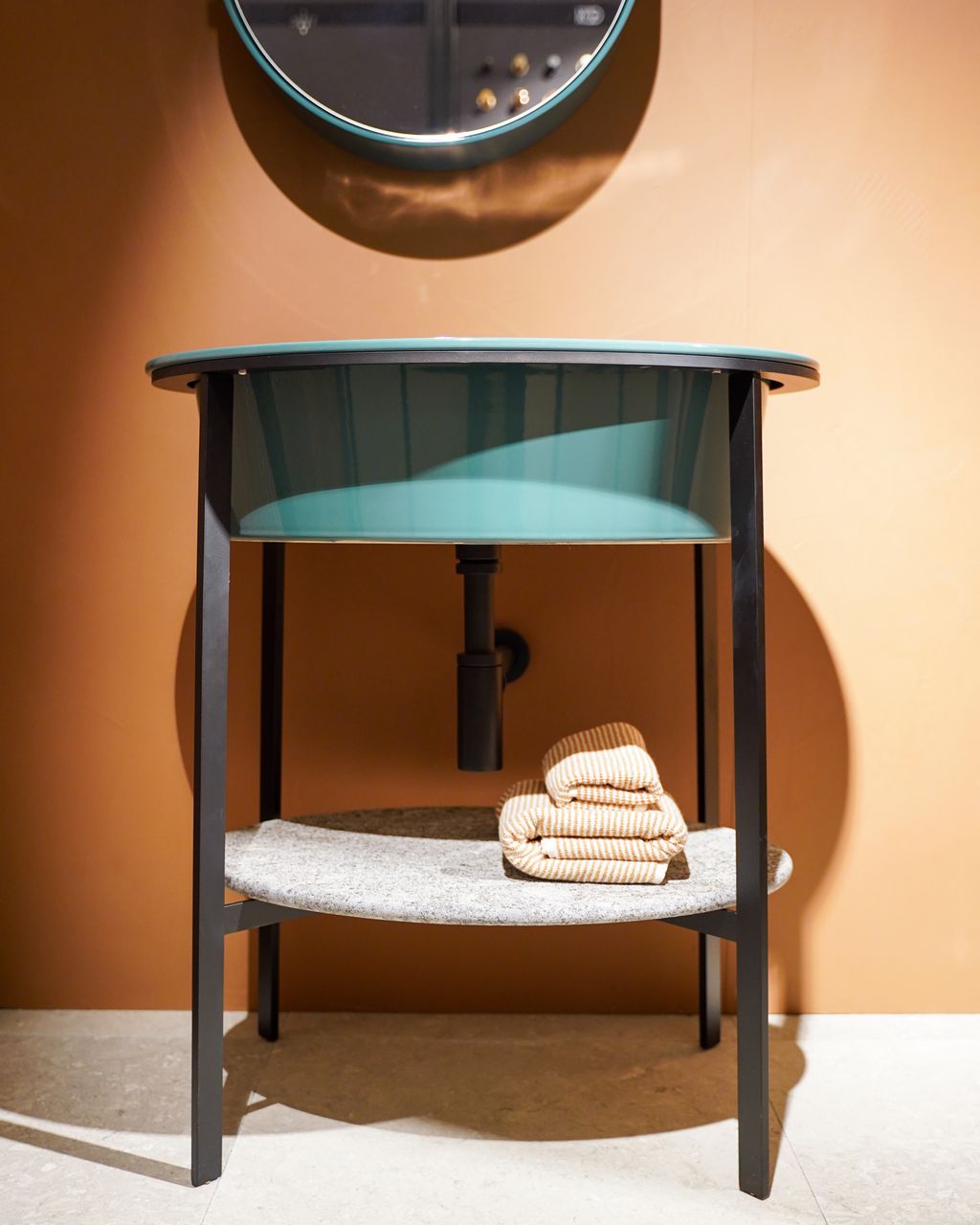 Cielo Catino Ovale. Medidas 70x50x83 cm. Acabado Acque Smeraldo CALAOSM + estante de marmol. Espejo contenedor Oval 50x12x90h Cm